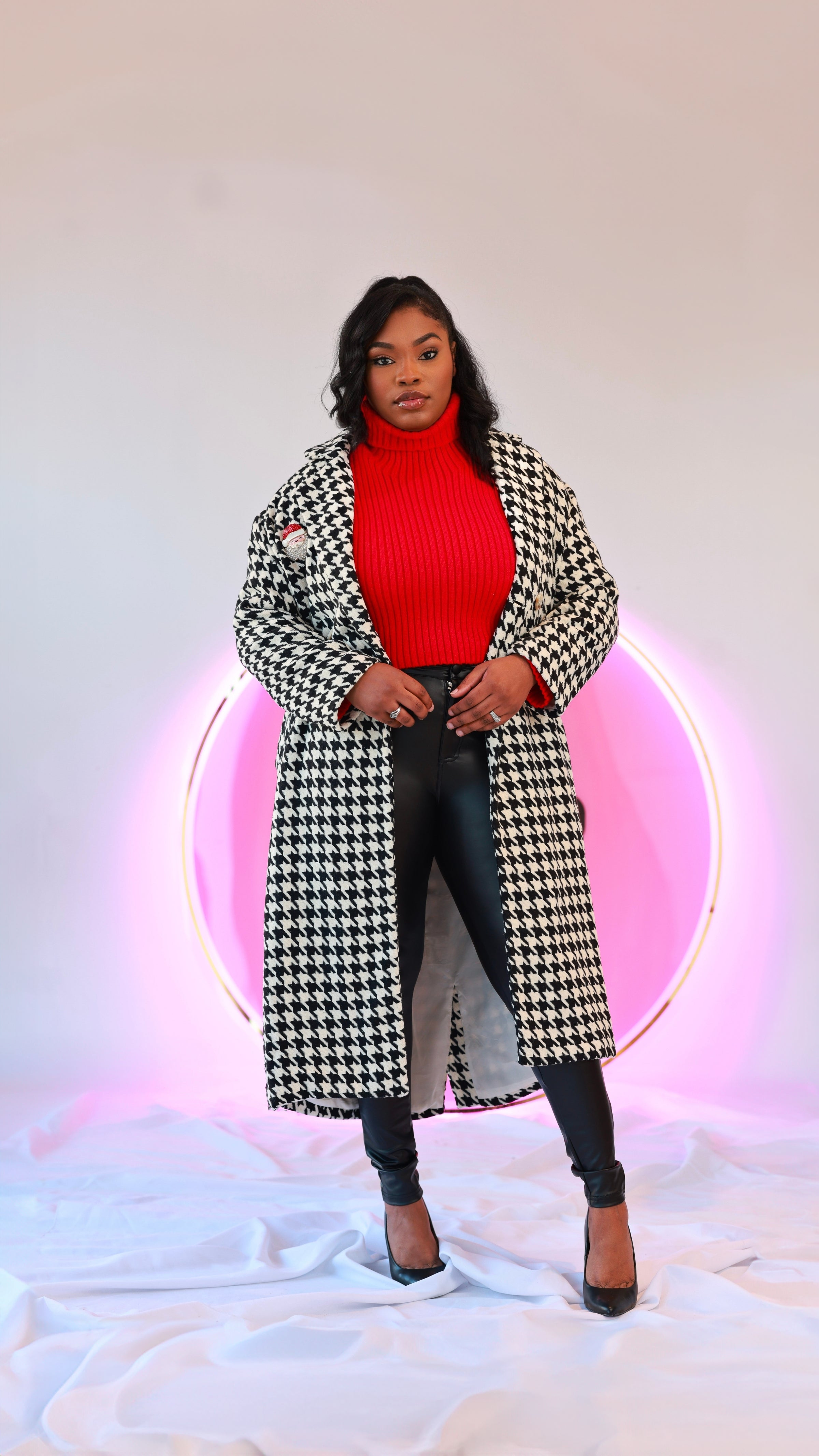 Elevate your outerwear collection with this timeless long coat in a bold houndstooth pattern. Crafted with meticulous tailoring, this piece features a sophisticated lapel collar and front button closure. Its relaxed silhouette ensures a comfortable yet flattering fit, perfect for layering over both casual and formal ensembles. Finished with side pockets for functionality, this coat is an essential garment that transcends seasons. Embodying classic charm with a modern edge, it's designed for the fashion-forward individual.